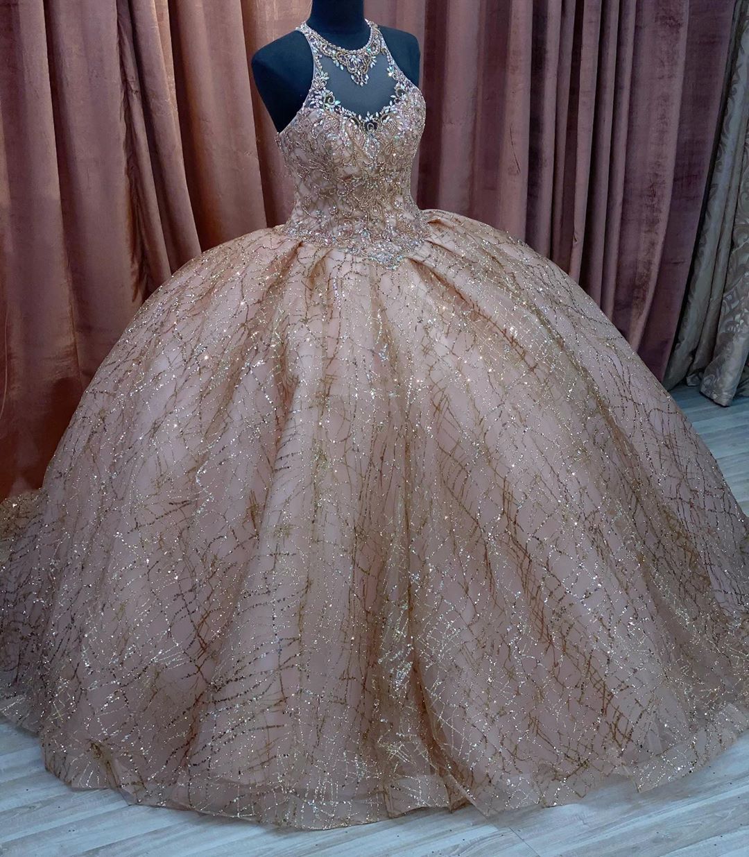 Sparkly Designer Rose Gold Sequined 2022 Prom Quinceanera Dresses Ball Gown Sheer Neck Jewel Crystal Bead Long Evening Formal Pageant Dress From Stunningdress88 128 9 Dhgate Com